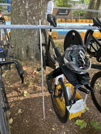 Sonntag… Race-Day… Standard-Frühstück „zwei Tassen Kaffee und zwei Semmeln mit Butter und Honig“, und ab ging es mit dem Rad (ca. 3km) zur Wechselzone. Einchecken und Wechselzone einrichten verlief routiniert. 07:30h war ich so weit fertig, bis zum Start um 08.30h also noch genug Zeit einer Triathletin beim Schlauchwechsel zu helfen.