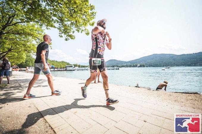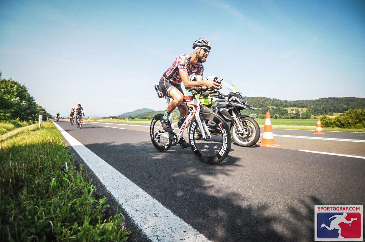 Ab zum Rad und los… der Magen hat schon gesagt „Hunger“ also gleich mal zwei Riegel gegessen. Könnte am sehr frühen Frühstück, in Verbindung mit dem eher späten Schwimmstart liegen. Was soll man zur Radstrecke sagen… landschaftlich phänomenal und durchaus fordernd. Nach 5km den ersten Crash (Serpentine bergab) und nach 7km den zweiten Crash (Streckenpfosten) mitbekommen. Also Konzentration hochhalten und aufpassen. KM 15 bis 30 sind auf einer Schnellstraße… geil… Kopf runter und mit etwas über 40km/h dahinfliegen. Dann wird es wellig. Teilweise kurze giftige Anstiege, gefolgt von schnellen Abfahrten und kurvigen Ortsdurchfahrten. Immer was los. Die ersten 90km in 2h 55min. erledigt. Halbzeit. Die zweiten 90km haben es in Sich. Erst leicht wellig am See entlang, dann geht es für knapp 15km ständig leicht bergauf… mehr als 24km/h geht hier fast nicht (sonst zieht es Dir den Stecker). Denn das schönste kommt ja noch… nach ca. 140km kommt er, der Rupertiberg. Mit bis zu 12% Steigung geht es hoch. Tlw. fangen Athleten an zu schieben so steil ist es. Im Wiegetritt und ersten leichten Krämpfen in den Oberschenkeln drücke ich nach oben. Nur nicht absteigen oder umfallen. Trotz der folgenden langen, leicht welligen Abfahrt reicht es „nur“ für einen Radsplit von 6h 03min... Bei knapp 1700HM aber für mich sehr gut.
